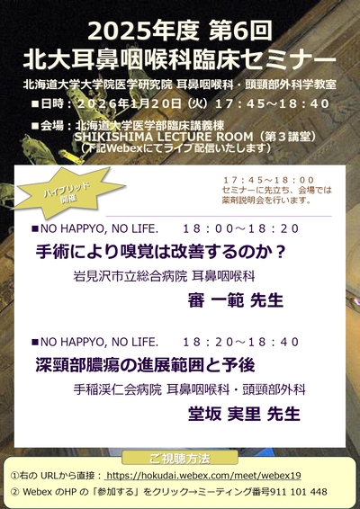 2025年度 第6回北大耳鼻咽喉科臨床セミナーのお知らせを掲載しました。